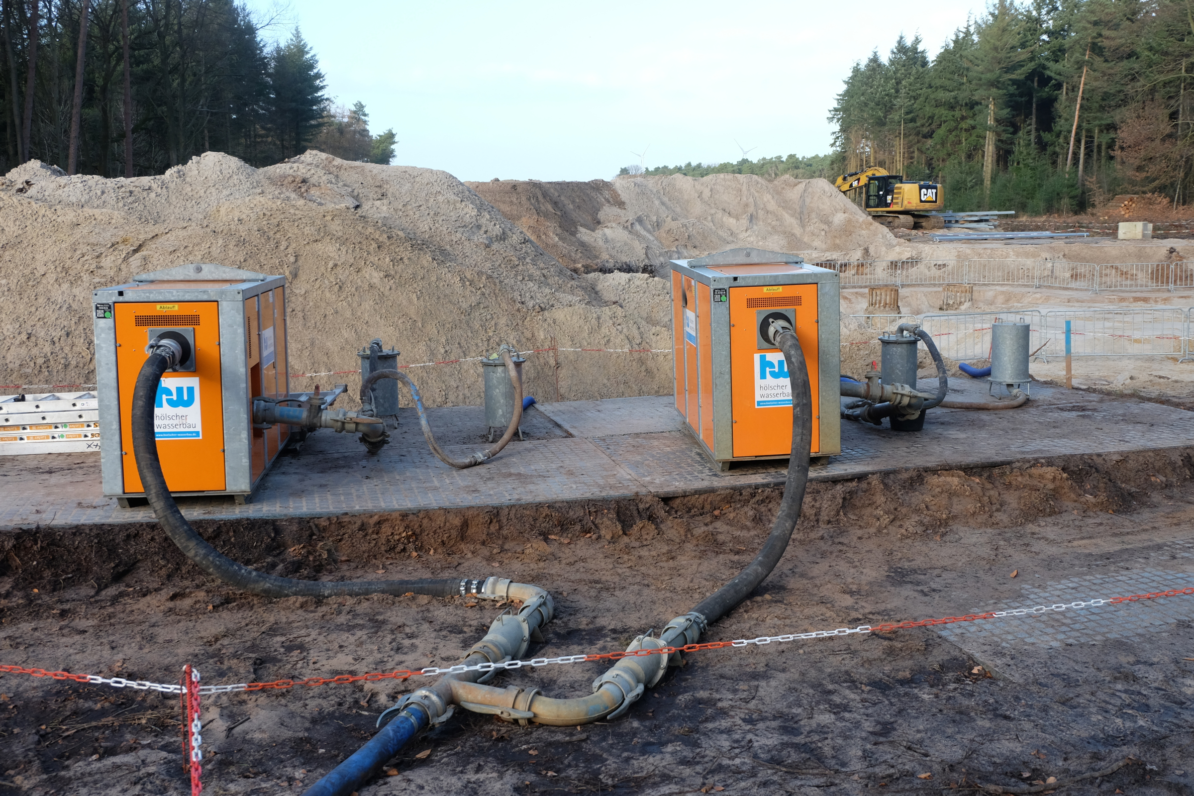 Am Steinfurter Maststandort (Nr. 150) nahe der Bahnstrecke zwischen Metelen und Burgsteinfurt saugt Amprion das Grundwasser aus dem Waldboden. Zwei große Pumpen befördern es aus der metertiefen Baugrube. In einem dicken blauen Schlauch strömt das wertvolle Nass ca. 250 Meter weiter außerhalb der Kahlschlagfläche in ein angrenzendes Waldgebiet.